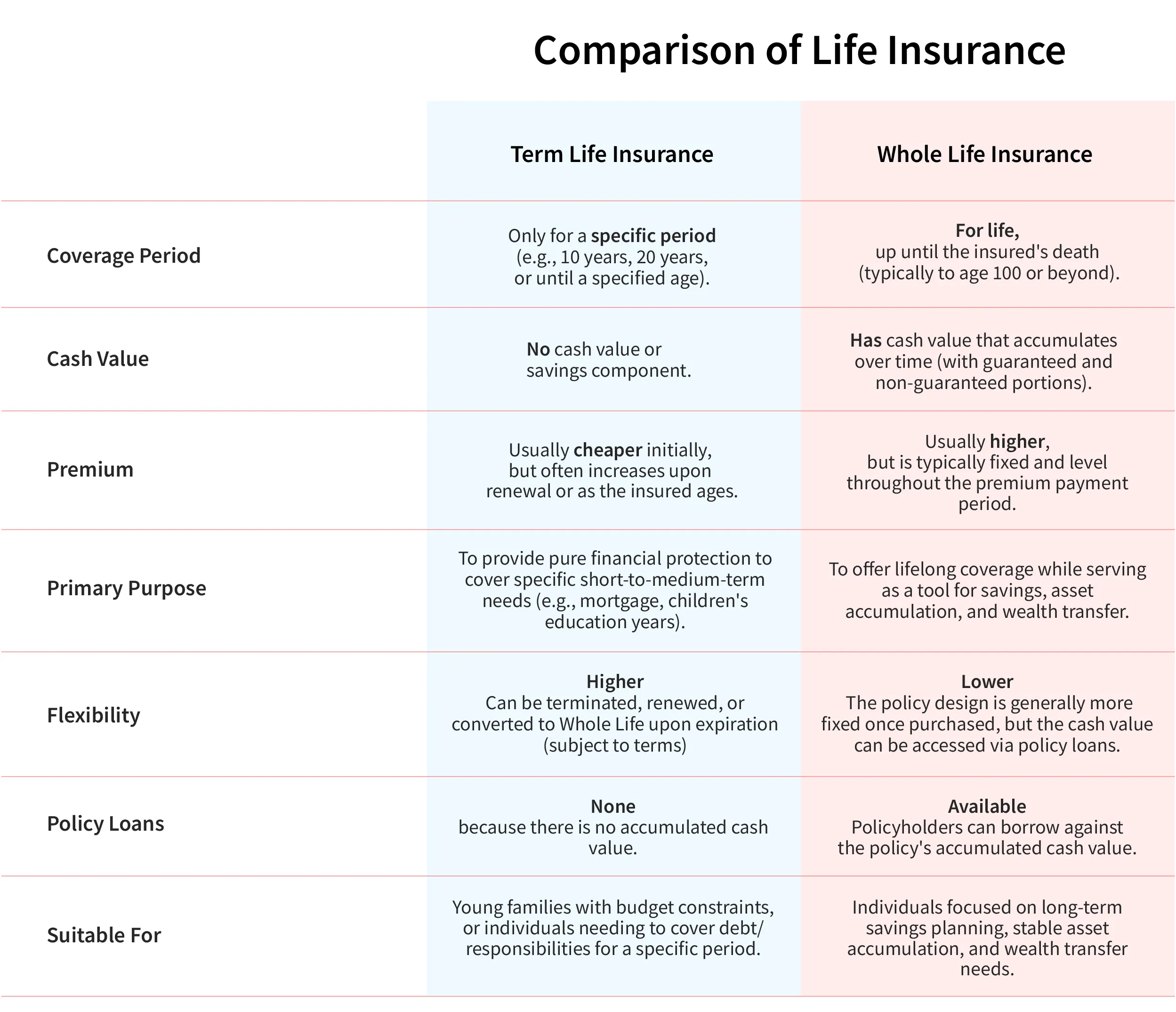 Life insurance provides financial protection for your loved ones. In the event of an unfortunate incident involving the insured, beneficiaries can receive a life insurance payout to support future family expenses, such as daily living costs, children's education, and mortgage payments. There are mainly two types of life insurance: term life insurance and whole life insurance. Term life insurance offers coverage for a specific period, while whole life insurance is effective for the insured's lifetime and pays out the insurance amount upon death.